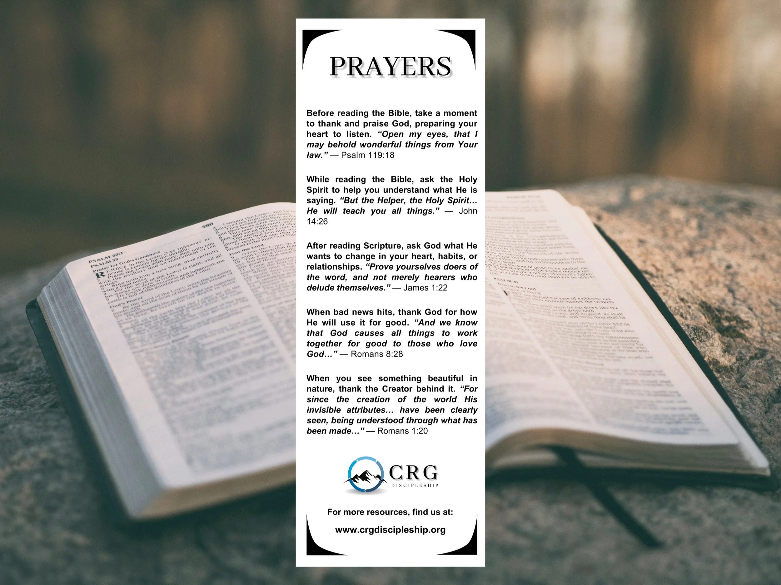 Prepare your heart and mind to receive the Word of God. This is a printable PDF that can be folded and slipped into your Bible. They are simple prayers that can read before, during, and after you read the Bible. There are also two additional prayers—one to express gratitude for God’s creation, and the other as a reminder that when times are tough, God is with us.
